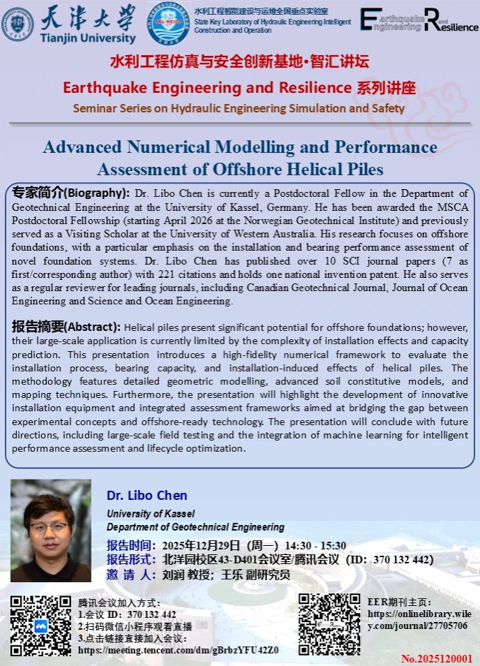 2025年12月29日下午14:30-15:30,应刘润教授和王乐副研究员邀请,德国卡塞尔大学(University of Kassel)陈力博(Libo Chen)博士将为大家带来题为“Advanced Numerical Modelling and Performance Assessment of Offshore Helical Piles”的学术报告。